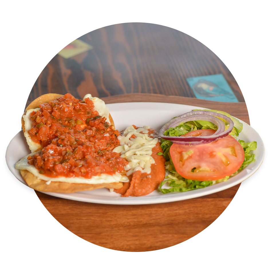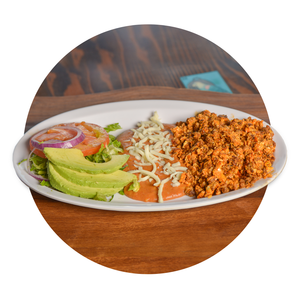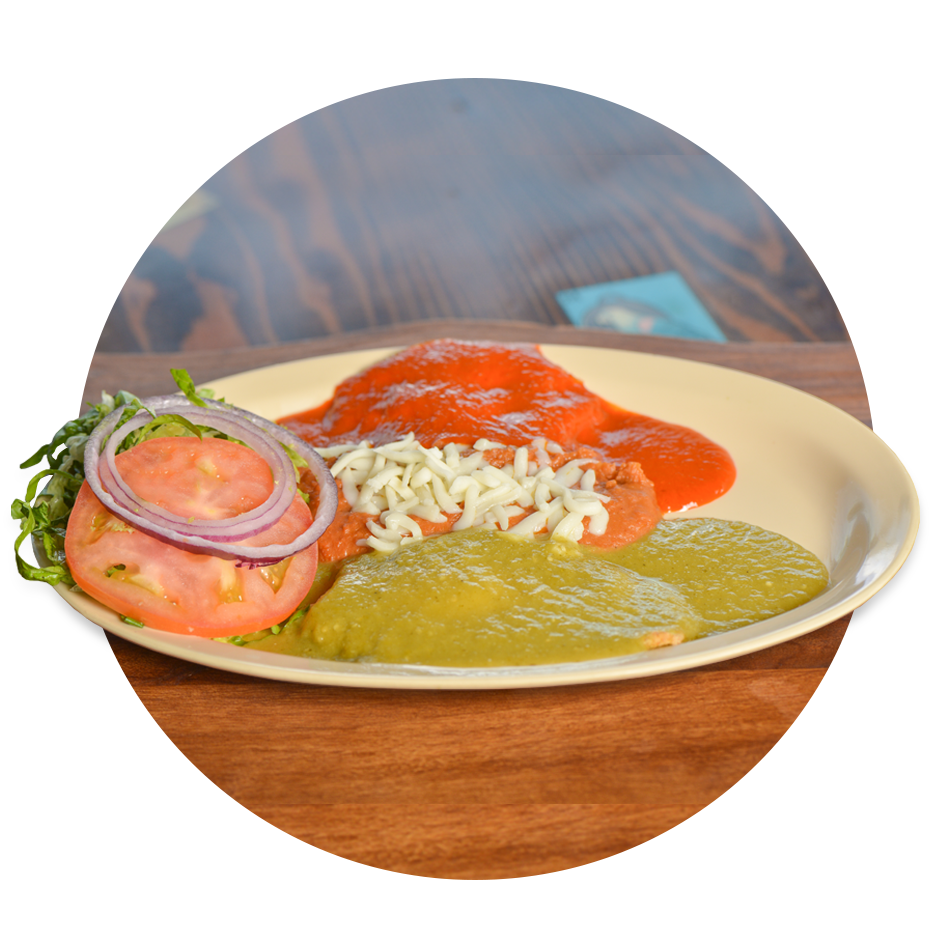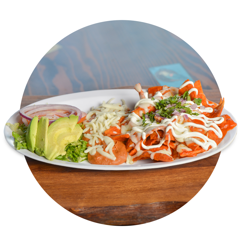 The Traditional dish consists of fried tortilla chips simmered in our delicious secret red or green salsa, Garnished with onions, cilantro and melted mozzarella cheese, accompanied by our famous and traditional refried beans, fresh shredded lettuce, delicious tomato and an avocado slice.